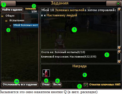 Самыое большое число вопросов в игре вызывают квесты. Расписать их все, конечно, не просто, поэтому я ограничусь общими моментами, а вы подхватывайте, если что сказать (ну и поправляйте, если я ошибусь). 1. Где мне вообще брать квесты? Тут все просто: подходим к человеку с желтым значком щита (могут также встретиться и серебряные) над головой и в диалоге с ним выбираем пункт "задание". 2. Кончились все квесты в округе, где мне их искать? Самый простой способ - это нажать на кнопку "Найти квесты" в окне заданий (гор. клавиша "Q"), желательно несколько раз. После каждого нажатия вам будет высвечиваться один NPC, готовый дать вам задание. 3. А как мне найти нужные координаты на карте? Ориентируйтесь либо по текущим координатам (показываются слева от мини-карты), либо расставляйте метки на большой карте. 4. У меня в списке квестов квесты разделены на группы - что это значит? Это значит то, что значит. Основными квестами яляются "общие", существуют и другие группы. Их тоже стоит выполнять, так как любой квест всегда дает что-то полезное. Например, квесты группы "вызов", как праивло приводят в данжеон. 5. А что тогда означают разные цвета квестов? Фактически, их крутость. Белый цвет означает, что за выполнение квеста (или линейки квестов) вы получите немного опыта, духа и денег (или только опыта, или, в редких случаях, только денег), синие и фиолетовые квесты подразумевают больше плюшек в качестве награды (как правило, за синие игрок получит много опыта и духа, а за фиолетовые еще и какой-нибудь крутой предмет). Наконец, выполнение оранжевых квестов повышает статус игрока (а она требуется для изучения умений). 6. Как мне найти колючку-мутанта/червя-демагога/сына драконьей пиявки/еще кого-нибудь? Включите свое воображение и смекалку. Во всяком случае, пока локализаторы не доделают перевод. Как правило, в тексте задания можно найти дополнительную подсказку для облегчения поиска, если подсказки нет, ищите мобов отвечающих критерию их названия в квесте. Кроме того, на начальном левеле мобов можно искать методом тыка, так ка кдроп квестовых итемов с них все равно 100%. 7. Дали квест на каких-то странных мобов. В округе я их не нашел, зато нашел в "пещере", куда попал через портал. Но он там очень сильные, что делать? Это групповой данжеон. Собирайте пати и вперед. 8. В данжеоне стоит странный столб с серебрянным квестовым щитом, но я взять его не могу - зачем он? Когда вам будут выдавать квесты в данжеон, вам также должны дать особую метку - "Знак". В инвентори выглядит как погоны. Они то как раз и требуется для взятия этого квеста. Для этого тот, у кого есть знак, должен быть лидером группы и подходить под требования расы (ну это само собой, если у вас знак есть). Вам дадут синий квест, который после выполнения засчитается всей группе вне зависимо от левела участников. 9. Зачем нужны квесты у стражников? За выполнение игрок получает Куски кристаллов, которые впоследствии можно обменять на камень бессмертных. 10. Взял квест, а метки нет/не знаю где искать - что делать? Попробуйте поискать квест на форуме. Благодаря тому, что в разделе "Квесты и гайды" постоянно задают вопросы, в большинстве случаев, удается найти полную информацию о нужном задании. 1- найти задание. Самая важная кнопка в этом окне - укажет, имя НПС, который хочет Вам дать квест, и его координаты. 2 - количество квестов, которые Вы мо